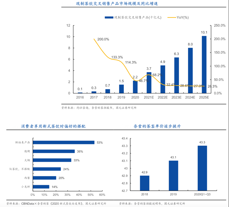 經(jīng)典案例:根據(jù)灼識(shí)咨詢(xún)、《2020新式茶飲白皮書(shū)》、奈雪的茶招股書(shū)、國(guó)元證券研究所等綜合資訊表明,新式茶飲的消費(fèi)場(chǎng)景不斷延伸,53%的消費(fèi)者表示在享用新式茶飲時(shí)偏好搭配烘焙類(lèi)產(chǎn)品,同時(shí),燒烤、火鍋與新式茶飲搭配也受到消費(fèi)者的青睞。奈雪推出軟歐包、甜品小食等交叉銷(xiāo)售產(chǎn)品,經(jīng)典烘焙產(chǎn)品超 25 款,豐富產(chǎn)品SKU 的同時(shí)提升客單價(jià)。2020年奈雪的茶平均客單價(jià)為43元,排名高端現(xiàn)制茶飲首位 (行業(yè)均值約為 35 元)。