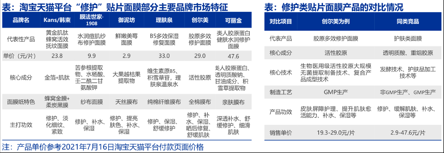 經典案例:根據標點醫藥、品牌天貓旗艦店、創爾生物招股書、申萬宏源研究等綜合資訊表明,膠原蛋白各個品牌的差別主要在于核心成份和面膜,活性膠原成分以修復等功效實現差異化競爭。膠原生廠商產品矩陣擴張:創爾生物等在醫療器械產品的基礎上,同步開發妝字號產品,添加更多成分,以達到修復之外的更多護膚功效。