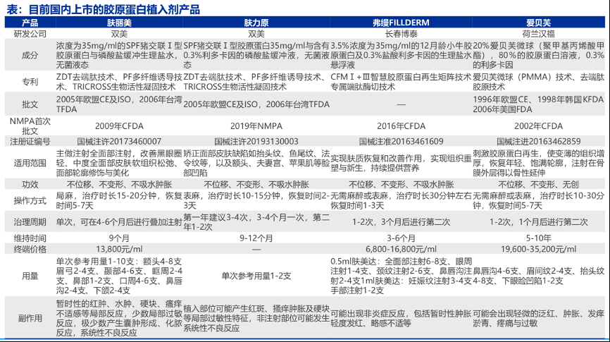 經典案例:根據國家藥監局、各公司官網、新氧、申萬宏源研究等綜合資訊表明,相比玻尿酸在國內已獲批40多款產品,目前國內上市的膠原蛋白注射填充劑的III類器械僅有3家公司:雙美、長春博泰、荷蘭漢福。