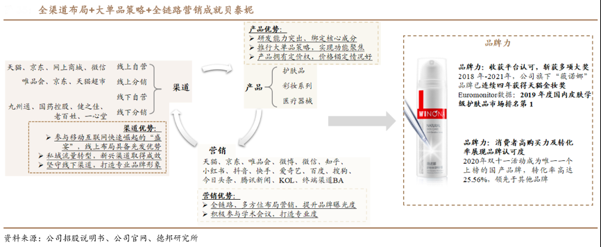 經典案例:根據公司招股說明書、公司官網、德邦研究所等綜合資訊表明,貝泰妮成立時間晚于海外品牌,但2019 年貝泰妮市占率已達到 20.5%,位列國內第一,全渠道布局、大單品策略和全鏈路營銷成就貝泰妮。