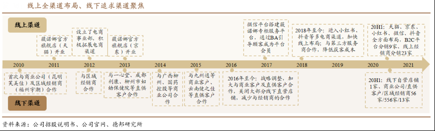 經典案例:根據公司招股說明書、公司官網、德邦研究所等綜合資訊表明,2017年薇諾娜在微信平臺搭建“薇諾娜專柜服務平臺”,在行業中率先實現了線上和線下的相互滲透,通過派駐在終端網點的 BA 與客戶進行溝通,后引導客戶加入會員,實現了以線下帶動線上的協同發展。
