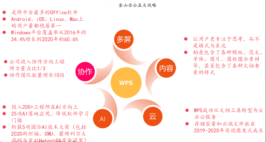 經典案例:根據金山辦公公眾號、方正證券研究所等綜合資訊表明,2018年7月,金山辦公提出了“多屏、內容、云、AI”辦公四大件,升級了新型智能辦公新形態;2020年12 月,在WPS「CHAO」辦公大會上,金山辦公提出了全新戰略“協作”,并發布了金山表單、金山會議、金山 日歷、金山待辦和FlexPaper”5款全新的協作產品,同時發布OFD、金山海報2款辦公組件和1款內容服務。