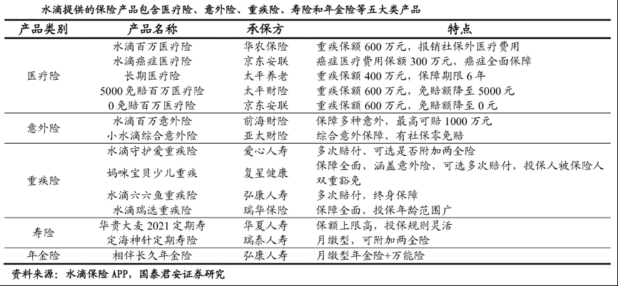 經(jīng)典案例:根據(jù)水滴保險(xiǎn)APP、國泰君安證券研究等綜合資訊表明,水滴對(duì)全渠道流量的運(yùn)營后,將其轉(zhuǎn)化為保險(xiǎn)和健康服務(wù)產(chǎn)品以實(shí)現(xiàn)流量的深度變現(xiàn)。“水滴”為客戶提供全產(chǎn)品矩陣的保險(xiǎn)產(chǎn)品,通過不斷的客戶運(yùn)營提升客戶LTV,提供的保險(xiǎn)產(chǎn)品包含醫(yī)療險(xiǎn)、意外險(xiǎn)、重疾險(xiǎn)、壽險(xiǎn)和年金險(xiǎn)等五大類產(chǎn)品。