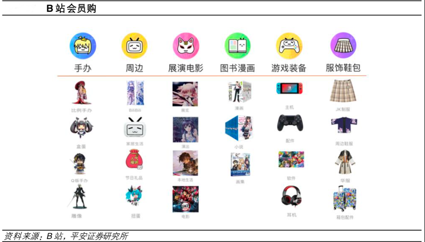 經典案例:根據B站、平安證券研究所等綜合資訊表明,B站電商主要聚焦 ACG 品類商品和服務,比如手辦、周邊商品、展演電影、圖書漫畫、游戲裝備、服飾箱包等。B 站電商業務亦屬于對垂類人群 “產業化”深耕的一部分,ACG 商品售賣與 B 站內容端游戲、動漫形成聯動,實現實物商品/服務 與精神文化(IP)的融合,更好的服務了核心 ACG 人群。