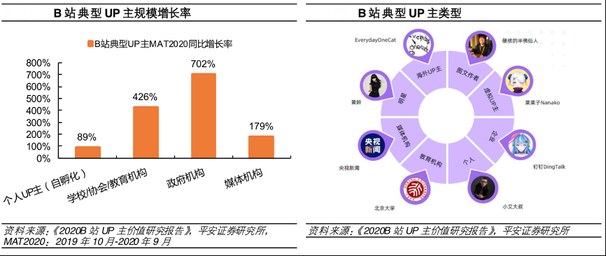 經典案例:根據《2020B站UP主價值研究報告》、平安證券研究所等綜合資訊表明,隨著 B 站不斷破圈,在年輕人中影響力越來越大,各個企業、媒體在 B 站做品牌形象運營的需求越來越大。2019年 10 月至 2020 年 9 月,學校、政府機構、媒體 UP 主增長率分別為 426%、702%、179%,增速明顯快于個人 UP 主同期89%的增速。