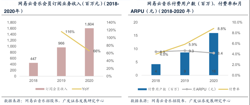 經(jīng)典案例:根據(jù)網(wǎng)易云音樂招股書、廣發(fā)證券發(fā)展研究中心等綜合資訊表明,網(wǎng)易云音樂的音樂會員收入在2020年達到16億元,月均會員對應(yīng)月活躍用戶的付費率為8.8%,會員數(shù)同比增長 85%,會員月ARPU為8.4元,同比下滑10%。其中2020年會員訂閱收入對整體在線音樂的收入貢獻逐步提速至61%。該比例在 2018、2019年分別為44%和54%。