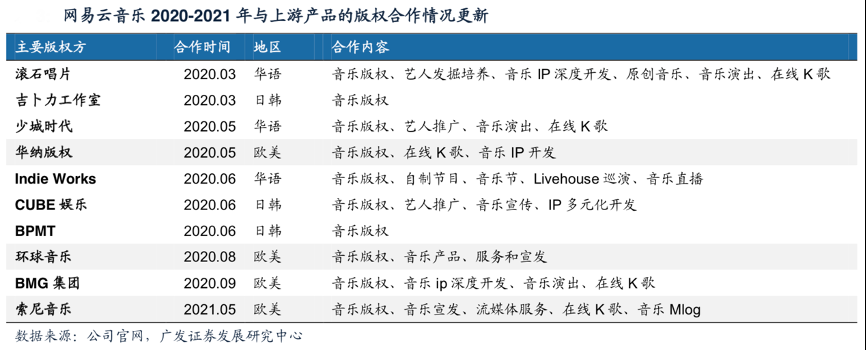 經(jīng)典案例:根據(jù)公司官網(wǎng)、廣發(fā)證券發(fā)展研究中心等綜合資訊表明,網(wǎng)易云音樂隨著TME對三大獨家代理版權(quán)的逐步解綁,網(wǎng)易云音樂從2020年開始陸續(xù)直接跟華納音樂、環(huán)球音樂獲取版權(quán)。2021年5月,網(wǎng)易云音樂和索尼音樂直接達成版權(quán) 合作,標志著三大唱片過去和TME的獨家代理模式成為歷史。