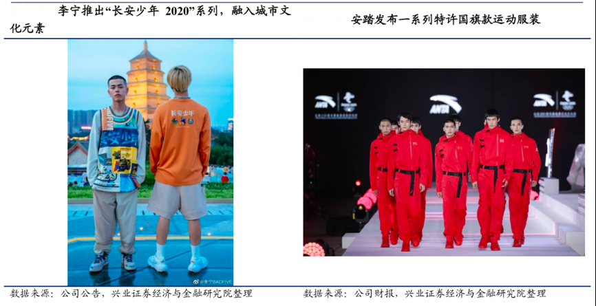 經(jīng)典案例:根據(jù)公司公告、公司財報、興業(yè)證券經(jīng)濟與金融研究院等綜合資訊表明,“中國李寧”中的產(chǎn)品系列名直接取材自中國傳統(tǒng)文化,如旗下的跑鞋就已采用了四大名駒其三的名字——“飛電、赤兔、絕影”,構(gòu)建與文化的直接聯(lián) 系。同時李寧構(gòu)建城市 IP 系列,深入中國本土挖掘城市特色,踐行城市文化的傳播。安踏成功獲得獨家特許權(quán),成為第一家能夠銷售帶有“國旗”產(chǎn)品的品牌,與 “中國品牌”的標(biāo)簽深度綁定。