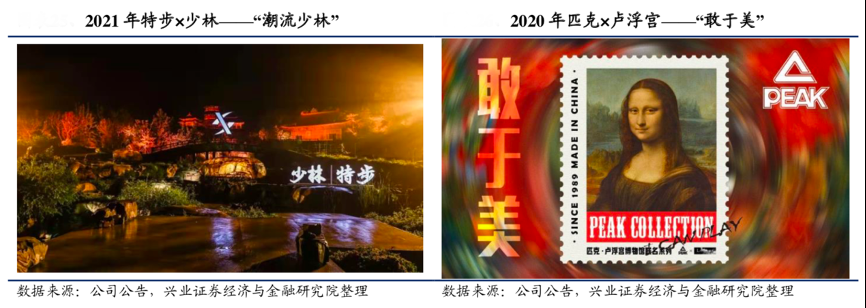 經(jīng)典案例:根據(jù)公司公告、興業(yè)證券經(jīng)濟與金融研究院等綜合資訊表明,特步深挖少林文化內(nèi)涵,是首個與少林聯(lián)名的品牌,在少林寺門前上演了 “開門見山”的國潮秀,此后開始陸續(xù)推出聯(lián)名系列;2021年 5 月 15 日,特步正式宣布將“特步少林”系列納入全新廠牌旗下,逐步完成與少林文化的深度合作。