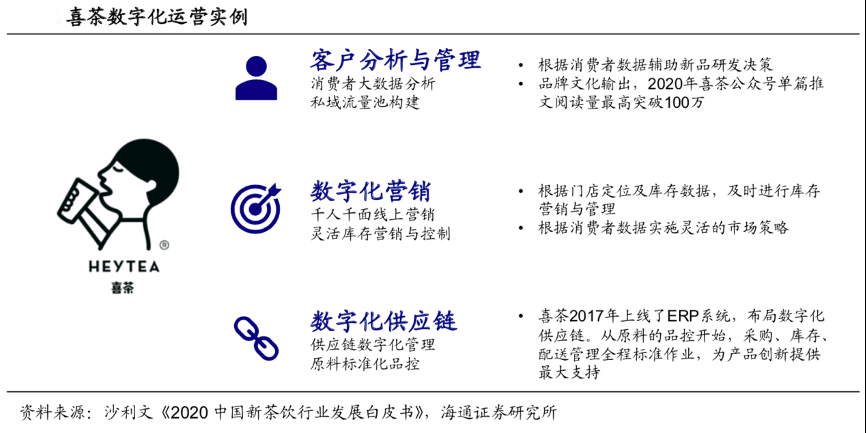 經典案例:根據沙利文《2020 中國新茶飲行業發展白皮書》、海通證券研究所等綜合資訊表明,除了喜茶 GO 小程序,喜茶在數字化運營上也進行了更多的探索,其根據門店定位及庫存數據,及時進行庫存營銷與管理,并根據消費者數據實施靈活的市場策略;2017年喜茶上線 ERP 系統,布局數字化供應鏈。從原料的品控開始,采購、庫存、配 送管理全程標準作業,為產品創新提供最大支持。