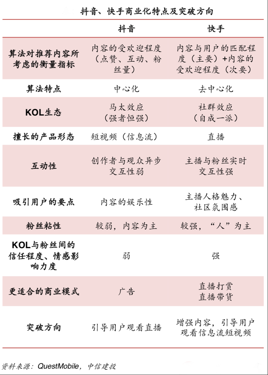經典案例:根據QuestMobile、中信建投等綜合資訊表明,基于抖音更加中心化與偏媒體的屬性,其商業模式更適合短視頻信息流下的廣告,而快手去中心化與偏社區的屬性,商業模式更適合直播,因此抖音、快手收入中,分別以廣告、直播占比更高。同時根據QuestMobile,抖音與快手重疊用戶的占比持續上升,到21年3月,二者重疊用戶分別占快手、抖音用戶數的58.2%/45%。