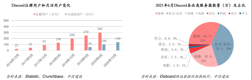 經典案例:根據Statistic、Crunchbase、Discord網站數據的爬取統計、中信建投等綜合資訊表明,Discord早期是一款游戲語音實時交流軟件,而后擴展成為一個綜合實時興趣社群,提供多領域的實時交流服務。部分廠商不具備自建社群的能力,Discord則可以架設相關的游戲社群,例如熱門游戲《Among US》的官方Discord社區擁有41.3萬用戶。Discord從一款游戲語音實時軟件做起,但在 2020年中宣布了全品類的戰略方向,目前在傳統的游戲(31.2%)和動漫(22.5%)外已開始向社交/音樂等其他社群擴展。