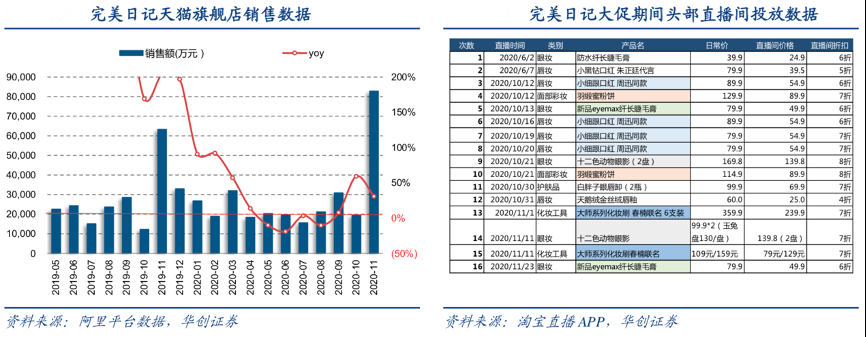 經典案例:根據阿里平臺數據、淘寶直播APP、華創證券等綜合資訊表明,在 2020 年的淘寶頭部 KOL 直播中,2020年6月與 10-11 月完美日記與李佳琦累積合作 16 樣產品,小奧汀合作 7 樣;小奧汀與薇婭累積合作 4 樣。同時從下圖完美日記天貓旗艦店 銷售額可以看出,2019 年 11 月與 2020 年的 11 月銷售額均有井噴式增長。完美日記通過小紅書營銷給用戶“種草”,再配合接下來 KOL 內容營銷與軟文投放福利折扣,打造爆 款,最終在營銷月折扣活動中實現“拔草”。