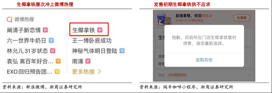 經典案例:根據新浪微博、瑞幸咖啡小程序、浙商證券研究所等綜合資訊表明,從咖啡品類上看,多個“爆款”的出現顯示出了咖啡這種誕生千年的飲料仍有巨大開發潛力。新式咖啡采用桂花等果味糖漿、冷萃等新型技術以及巧克力、燕麥奶等新 型添加劑,口味新穎且更加吸引年輕人。