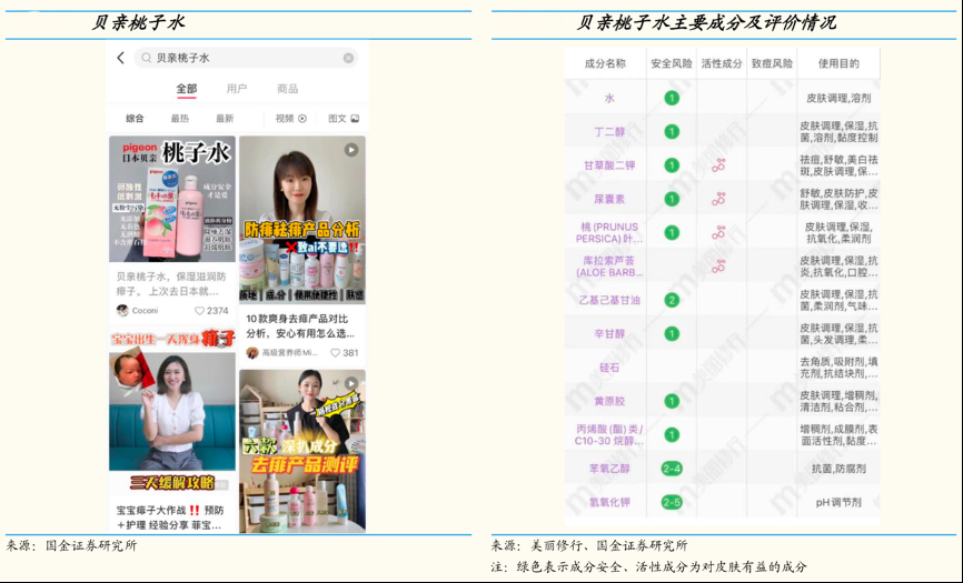 經典案例:根據美麗修行、國金證券研究所等綜合資訊表明,貝親為日本綜合嬰童品牌,產品線包含嬰幼兒喂養用品(奶瓶、奶嘴等)、沐浴潤膚產品、清潔用品(衣物、奶瓶清潔劑及工具)、濕巾產品、孕產用品等。其中護膚明星產品為桃子水(又稱為桃葉水/桃葉精華),具有祛痱止癢、緩解紅癢等功效,為小紅書博主熱門推薦產品及日本代購熱門產品。