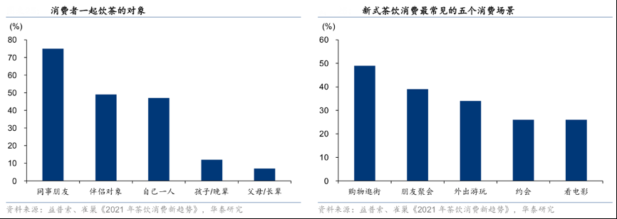 經典案例:根據益普索聯合雀巢發布的《2021 年茶飲消費新趨勢》、華泰研究等綜合資訊表明,茶飲帶來的豐富情感提升也是消費者選擇新茶飲的主要動因,其次才是茶飲產品對功能需求的滿足。消費者在喝茶飲時通常與身邊的同事、同學、朋友(75%)進行分享,其次是與伴侶(49%)或獨處時(47%),逛街購物、朋友聚會、外出游玩成為了最主要的茶飲消費場景。