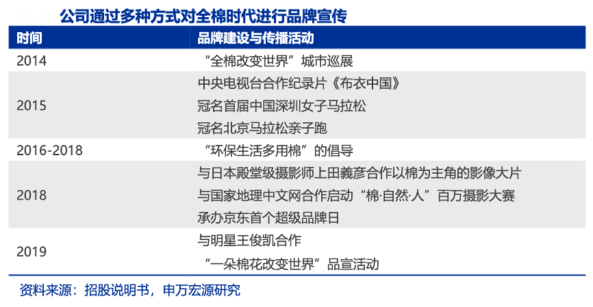 經典案例:根據招股說明書、申萬宏源研究等綜合資訊表明,全棉時代以“醫學貼近生活、全棉呵護健康”為品牌主張,主打“舒適,健康,環保”理念,針對不同生活場景推出以棉替代化纖的產品,通過品牌巡展、明星代言、賽事贊助等多種方式進行品牌宣傳,知名度不斷提升。2015 年,全棉時代獨家冠名首屆中國深圳女子馬拉松、冠名北京馬拉松親子跑,針對性提升品牌在女性、親子兩類核心客群中知名度。2019 年,全棉時代榮獲由CCTV 主辦的“新中國成立 70 周年 70 品牌”之譽。