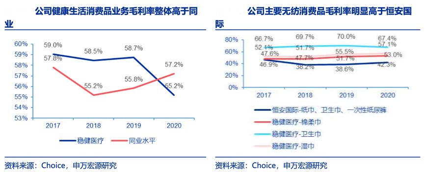 經典案例:根據choice、申萬宏源研究等綜合資訊表明,2020年穩健醫療公司棉柔巾(53.0%)、衛生巾(67.4%)、濕巾(57.1%)毛 利率均明顯高于可比公司恒安國際(42.3%)。公司優勢包括:a)全產業鏈優勢。不同于恒安國際需要向上游采購無紡布,公司可以自主生產棉柔巾、衛生巾的主要原材料無紡布; b)附加值優勢。其產品依托全棉水刺無紡布技術,具有議價能力,附加值相對更高。