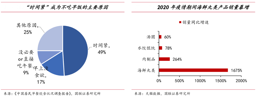 經(jīng)典案例:根據(jù)《中國居民早餐飲食狀況調(diào)查報(bào)告》、天貓數(shù)據(jù)、國聯(lián)證券研究所等綜合資訊表明,由于外出行動限制,家庭用餐頻率高增,速凍食品銷售量大幅增加。根據(jù)天貓平臺統(tǒng)計(jì)數(shù)據(jù)顯示,2020年春節(jié)期間,速凍食品 銷售額普漲,其中海鮮丸類銷量同比增長 1675%,速凍肉制品也增長 264%。