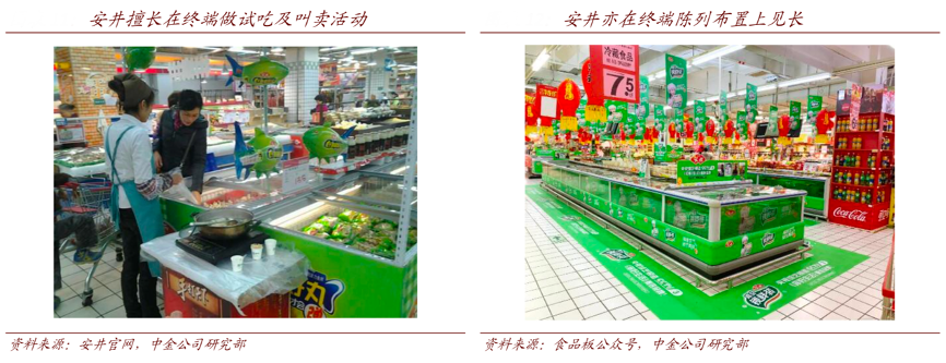 經典案例:根據安井官網、食品板公眾號、中金公司研究部等綜合資訊表明,安井支持服務中亦包含面向 C 端的營銷活動,配合經銷商搶占地方市場份額,具體表現為:通過開展主題活動、有獎銷售等終端促銷活動增強與消費者間的互動,促進經銷商、銷售終端的銷量增長;支持經銷商 C 端產品進場費,支持贈品物料,首月進貨支持及高空廣告支持等。根據公司的公眾號披露,安井也會在營銷培訓中專門培訓銷售人員叫賣等技能。
