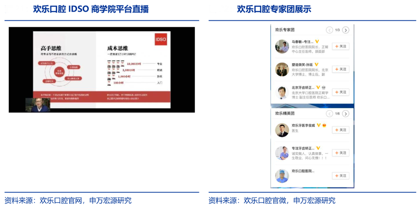 經(jīng)典案例:根據(jù)歡樂(lè)口腔官網(wǎng)、歡樂(lè)口腔官微、申萬(wàn)宏源研究等綜合資訊表明,以歡樂(lè)口腔為例,其為個(gè)體品牌牙醫(yī)提供 2B 服務(wù), 包括投資、實(shí)體診所、醫(yī)院建設(shè)、證照辦理等系列服務(wù),醫(yī)生合伙人可以在新診所持有 70% 的股權(quán)。公司致力于給自己打上“醫(yī)生創(chuàng)業(yè)”標(biāo)簽,商業(yè)模式類似于“女團(tuán)造星”,通過(guò)直播和培訓(xùn)的方式輸出名醫(yī)IP,通過(guò)流量方式裂變口碑傳播路徑,加速品牌滲透。
