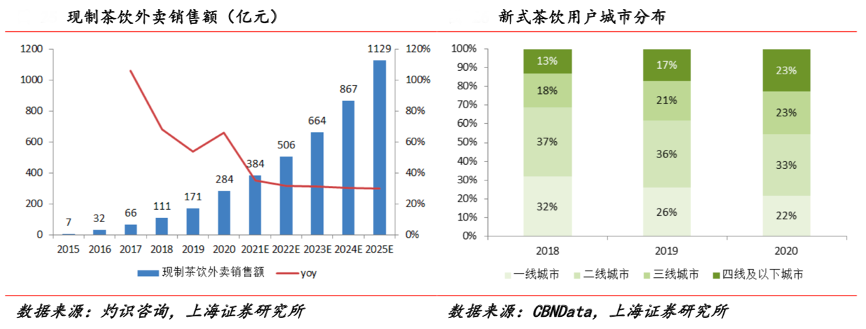 經典案例:根據灼識咨詢、CBNData、上海證券研究所等綜合資訊表明,從市場下沉來看,2020年新式茶飲在一線、二線、三線、四線及以下城市市場增速分別為40.53%、52.24%、81.9%、124.7%,三線以下城市新式茶飲市場有很大的增長空間。目前現制茶飲門店多位于一二城市,而三四線城鎮青年群體消費意愿強烈,其將呈現向三四線城市下沉趨勢。