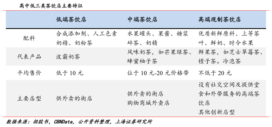 經典案例:根據招股書、CBNData、公開資料整理、上海證券研究所等綜合資訊表明,近年來隨著對新式茶飲體驗的需求不斷增長,顧客更愿意為提升消費體驗支付更多的費用,因此涌現了大批高端的現制茶飲點店。以平均售價劃分,現制茶飲店可分為三類:高端店(平均售價不低于 20 元)、中端店(10元-20 元)、低端店(低于10元)。高端茶飲店以優質茶葉代替茶粉、以新鮮水果代替糖漿、以進口奶油代替奶精,同時注重場景設置和門店的空間體驗,致力于為顧客提供一個集社交與休閑屬性于一體的場所。