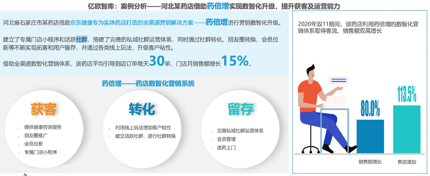 經(jīng)典案例:根據(jù)億歐智庫《億歐智庫-醫(yī)藥行業(yè):2021年中國藥店創(chuàng)新趨勢報告》等綜合資訊表明,藥店借助全渠道數(shù)智化營銷體系,通過會員管理、送藥上門、客戶社群運(yùn)營、門店小程序、店員零售助手、分銷商城等,全方位提升客戶運(yùn)營及獲客能力,全面提升藥店客流并最終推動銷售增長。