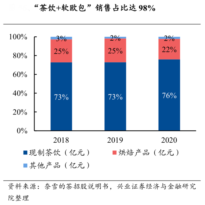 經(jīng)典案例:根據(jù)奈雪的茶招股說明書、興業(yè)證券經(jīng)濟與金融研究院等綜合資訊表明,奈雪的茶“茶飲+軟歐包”銷售占比達98%,其配備完備的烘焙產(chǎn)品線,意在一開始就打出“一杯好茶,一口軟歐包”的口號,已經(jīng)成為消費者心中的品牌記憶點。