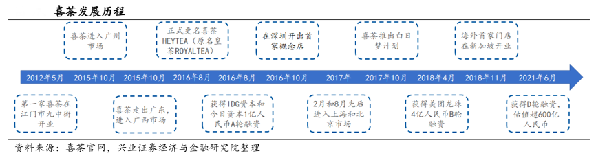 經(jīng)典案例:根據(jù)喜茶官網(wǎng)、興業(yè)證券經(jīng)濟與金融研究院等綜合資訊表明,喜茶是新式茶飲的開創(chuàng)者,其產(chǎn)品創(chuàng)新性地使用了原葉茶基底并搭配上芝士奶蓋,受到消費者的廣泛好評。2012 年 5 月,第一家喜茶在江門市開業(yè)。2020 年 6 月,喜茶獲得 D 輪融資,估值超過 600 億人民幣。喜茶集聚中國文化傳統(tǒng)與創(chuàng)意創(chuàng)新于一體,專注于呈現(xiàn)優(yōu)質(zhì)茶香,開啟了新式茶飲風潮。