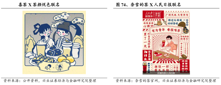經典案例:根據公開資料、奈雪的茶官網、興業證券經濟與金融研究院等綜合資訊表明,自 2017 年以來,喜茶聯名 50 多家,聯名涉及食品、服飾、文創、日用品、化妝品、互聯網等各個領域。奈雪的茶則與王者榮耀、人民日報、杯子美術 館、亞朵抖音、李寧、安德瑪等 15 個品牌合作推出品牌跨界營銷活動。