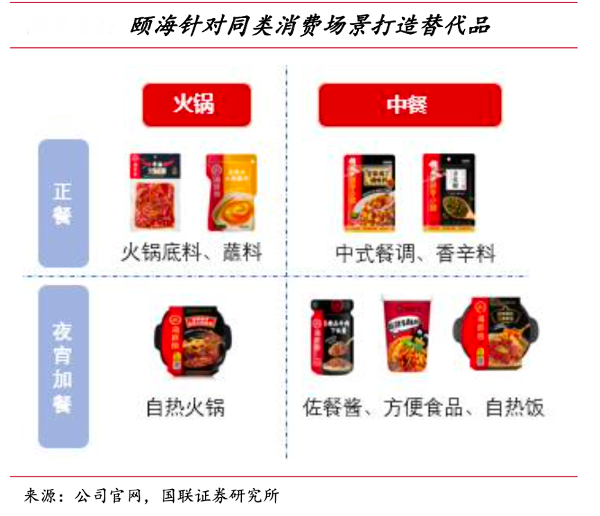 經典案例:根據公司官網、國聯證券研究所等綜合資訊表明,頤海在產品開發上更為注重同類消費需求下不同場景的產品挖掘,擴展潛力更強。復合調味品消費者主要是對口味有追求、烹飪能力和時間相對有限的年輕群體,因此頤海在品類擴容上選中方便食品作為第二核心,同樣針對此類群體在較為常見的夜宵、加班、加餐等場景下的消費需求打造了沖泡、休閑食品。