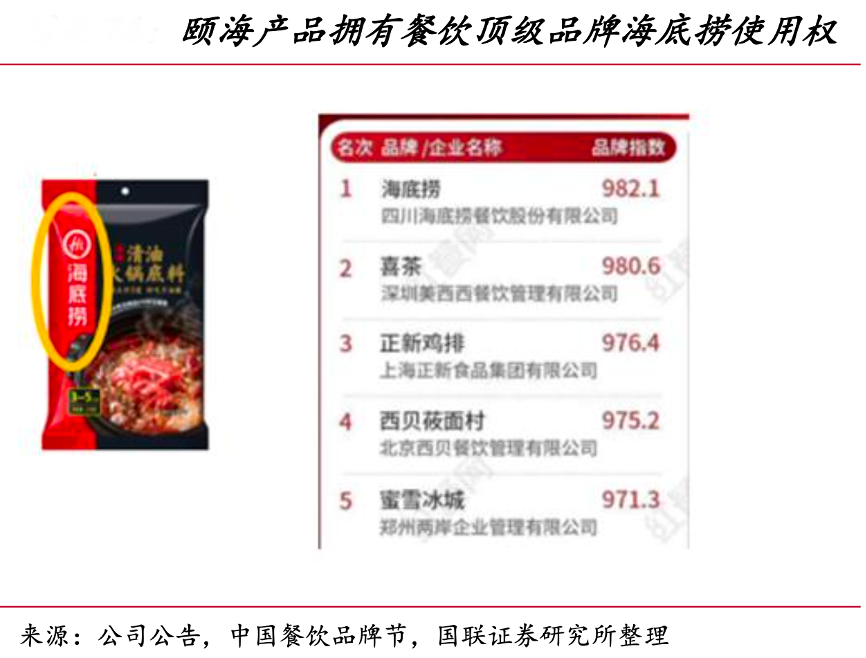 經典案例:根據公司公告、中國餐飲品牌節、國聯證券研究所等綜合資訊表明,頤海國際在廣告營銷的投入低于天味。其更愿意通過更為扎實的產品來獲得用戶 的口碑,如同海底撈依靠無形服務帶動用戶口碑傳播。另外,頤海由于主要產品使用 海底撈品牌,在廣告投放上可能與餐飲端海底撈產能影響,因此在廣告營銷投入意愿 較低。在火鍋底料業務上,頤海依靠海底撈的使用權擁有相 對較強的領先優勢。根據中國餐飲品牌節 2019 年推出的餐飲品牌力榜單中,海底撈 奪得榜首。