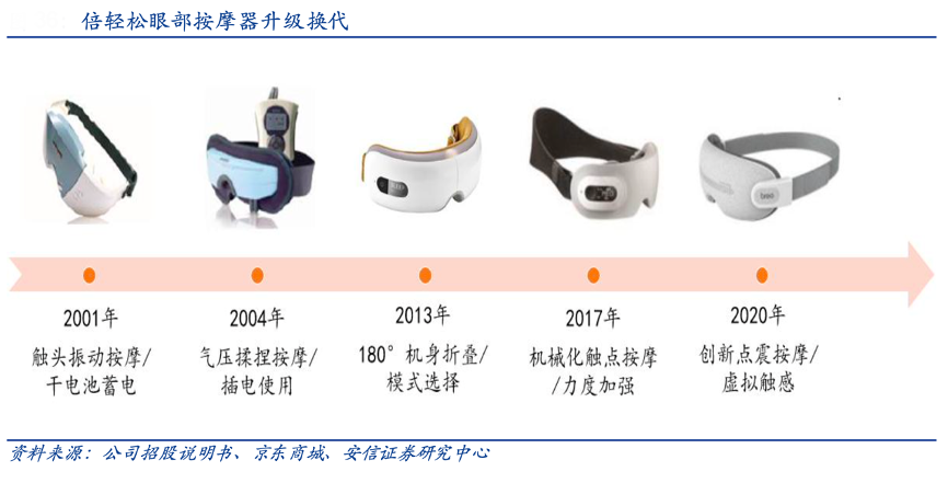 經典案例:根據公司招股說明書、京東商城、安信證券研究中心等綜合資訊表明,倍輕松眼部按摩器主打溫控熱敷、調頻振動、機 械揉捏、智能控制等功能特點,結合砭針灸等中醫理論,模擬真人手指的手法和觸感,提升用戶的按摩體驗。公司旗艦產品 iSee K 集成 16 顆線性馬達和 16 個獨立觸點,采用 DSP+MCU 雙核處理器,利用 DSP 算法驅動和間歇性長短振來實現點震按摩技術。由于 16 個觸點可獨立控制,iSee K 可準確觸動眼周穴位并避免拉扯眼部肌膚,凸顯了其較強的技術研發實力。
