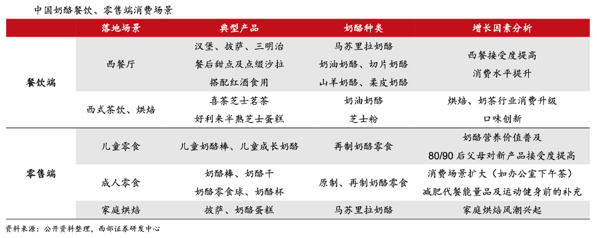 經典案例:根據公開資料、西部證券研發中心等綜合資訊表明,隨著消費者健康意識的增強,健康營養與方便快捷兼備的零食受到追捧,富含鈣、蛋白質等多種營養的創新奶酪零食兒童奶酪棒成為年輕父母的選擇;此外,疫情催化家庭烘焙流行,馬蘇里拉奶酪碎實現由 B 到 C 切換,開始發力零售市場。對比日韓,我國奶酪市場尚有10 倍空間。根據歐睿,2020 年我國奶 酪 C 端市場規模 99.82 億元,長期空間可看千億。