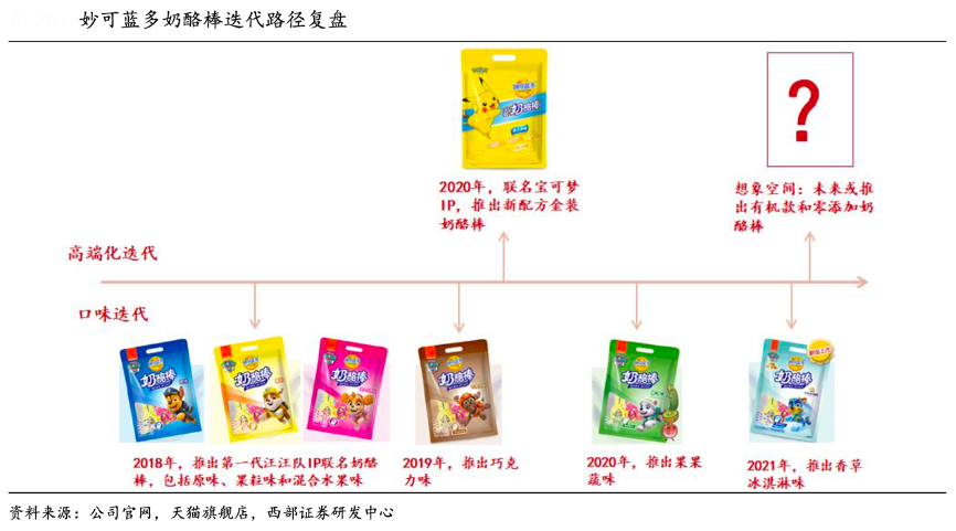 經典案例:根據公司官網、天貓旗艦店、西部證券研發中心等綜合資訊表明,從產品迭代來看,主要奶酪棒品牌都有推出多種口味產品,口味迭代優勢在于擴大終端陳列+吸引多樣化消費群體,其中妙可藍多迭代路徑分化,除了基礎款口味迭代之外,還推出高端化產品“精靈寶可夢聯名金裝奶酪棒”,助力產品結構升級。