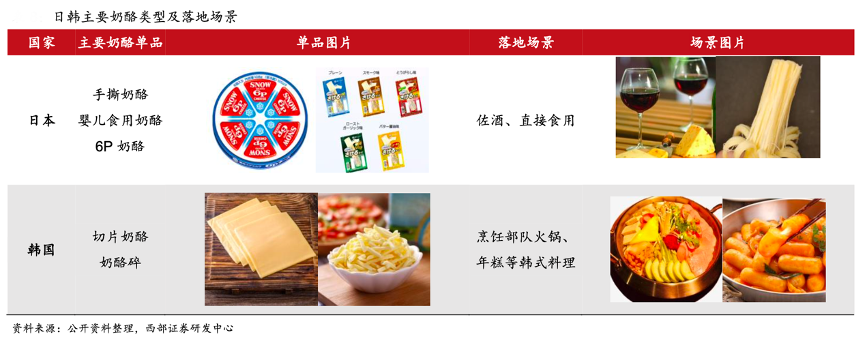 經典案例:根據公開資料、西部證券研發中心等綜合資訊表明,日韓競爭格局的差異源于奶酪在兩國不同的落地場景,零食端餐桌端來看,日本零食奶酪發展蓬勃,手撕奶酪、嬰兒食用奶酪、6P 奶酪等零食大單品百花齊放,我國奶酪 C 端市場與日本相似,目前由零食端占據主導,具備孕育行業龍一的市場環境。