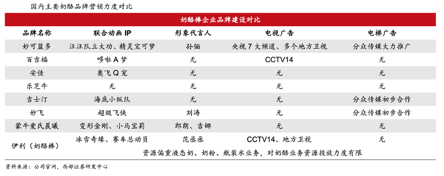 經典案例:根據公司官網、西部證券研發中心等綜合資訊表明,妙可藍多立足明星單品奶酪棒,通過“動畫IP+形象代言人+電視廣告+分眾”的 全方位營銷組合拳,立體化打造品牌力,創造優質的用戶消費體驗。