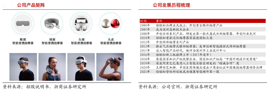經(jīng)典方法:根據(jù)招股說明書、公司官網(wǎng)、浙商證券研究所等綜合資訊表明,倍輕松成立于2000年,是一家專注于健康產(chǎn)品創(chuàng)新研發(fā)的高新技術(shù)企業(yè),主要從事智能便攜按摩器的設(shè)計、研發(fā)、生產(chǎn)、銷售及服務(wù)。其曾在行業(yè)內(nèi)首創(chuàng)眼部與頭部按摩器品類產(chǎn)品,此后不斷橫向拓展頭部、頭皮、足部等按摩產(chǎn)品。其 產(chǎn)品銷售以自主品牌“breo”和“倍輕松”系列產(chǎn)品為主,同時還為其他知名品牌企業(yè)提供 ODM 定制產(chǎn)品。