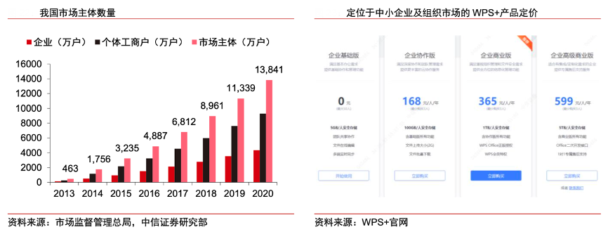 經(jīng)典案例:根據(jù)市場(chǎng)監(jiān)督管理總局、WPS+官網(wǎng)、中信證券研究部等綜合資訊表明,截至 2020 年我國(guó)市場(chǎng)主體數(shù)量近 1.4 億戶,其中企業(yè)數(shù)量 超過(guò)4300萬(wàn)戶,且絕大多數(shù)是中小企業(yè)。WPS+定位于中小企業(yè)及組織市場(chǎng), 中信證券研究部以該產(chǎn)品三檔定價(jià) 168、365、599 元/人/年為參考,假設(shè)每家企業(yè)購(gòu)買(mǎi)最低限度人次的產(chǎn)品(3人)、中小企業(yè)數(shù)量 3900 萬(wàn)戶(企業(yè)總數(shù)的 90%),參照海外 Office 365 推廣情況,中信證券研究部估算每年中小企業(yè)市場(chǎng)空間(按三檔產(chǎn)品定價(jià)保守/中性/樂(lè)觀逐步滲透)有望分別達(dá)到 197 億元、427 億元、701 億元。