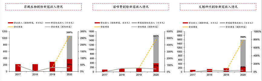 經典案例:根據wind、公司公告和國聯2020年,菲鵬生物、諾唯贊和義翹神州的收入分別為10.7億、15.6億和16.0億元,同比增速分別為269%、482%、782%,(扣除新冠疫情業務收入后)主業收入分別為3.7億、3.8億和2.5億元,同比內生增速分別為28%、43%和40%。
