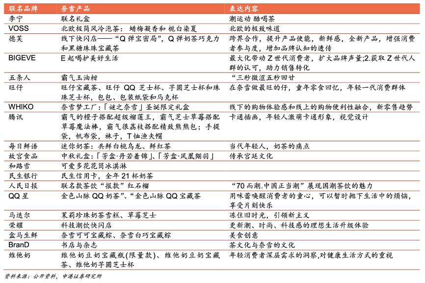 經典案例:根據公開資料、申港證券研究所等綜合資訊表明,奈雪產品與李寧、五條人等展開多種“聯合合作”,品牌影響力持續擴大。