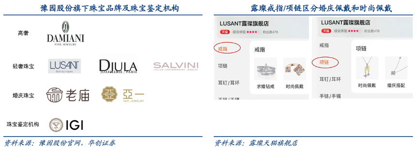 經典案例:根據豫園股份官網、露璨天貓旗艦店、華創證券等綜合資訊表明,豫園通過收購、合資等方式深耕珠寶時尚領域,2021 年 8 月 12 日公司推出自有培育鉆石品牌露璨(LUSANT),與新中式黃金珠寶品牌老廟、法國設計師珠寶品牌 DJULA、意大利奢華珠寶品牌 DAMIANI 等構成豫園珠寶時尚集團的品牌矩陣,成為第一個布局該領域的國內知名珠寶集團。