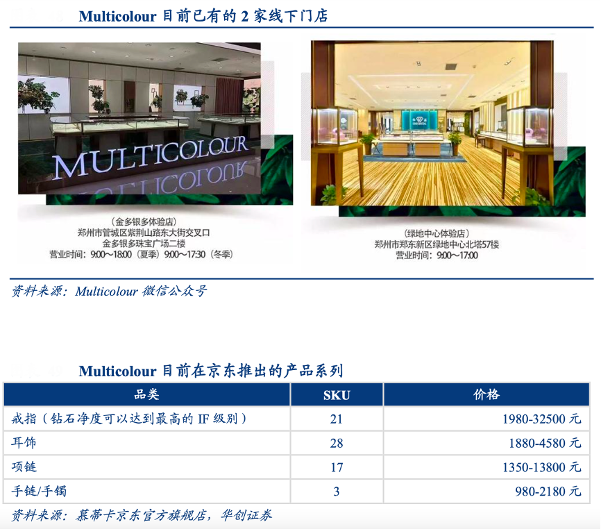 經典案例:根據Multicolour微信公眾號、華創證券等綜合資訊表明,Multicolour 是鄭州華晶旗下的培育鉆石品牌,其公司在自主研發培育鉆石技術上已經獲得了百項國家專利,并將其應用到輕奢時尚珠寶的設計,Multicolour 成為了首家擁有培育全色系彩色鉆石專利的珠寶品牌,自主研發保障產品品質,公司的戒指品類中鉆石凈度可以達到 IF 級別。Multicolour鉆石珠寶推崇女性精致穿搭,以豐富多面的款式選擇,成就女性自身魅力的極致追求。