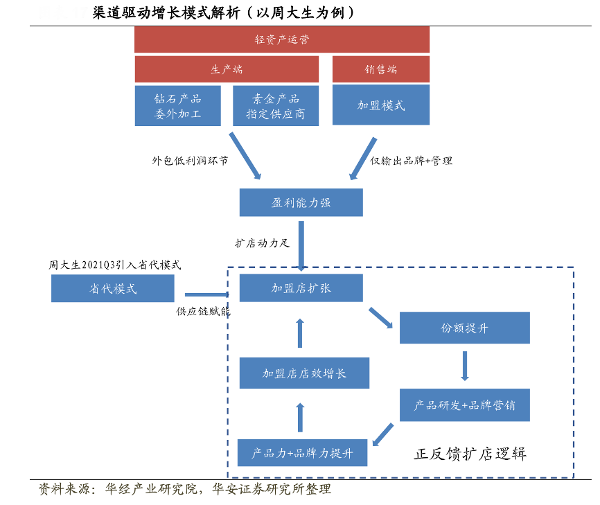 經典案例:根據(jù)華經產業(yè)研究院、華安證券研究所等綜合資訊表明,周大生通過“經營模式+運營管理”上的差異化,逐步建立起自身渠道優(yōu)勢以及步入產品、品牌持續(xù)提升的正反饋通道。(1)經營模式上,周大生采用生產端委外加工+指定供應商、銷售端加盟為主的輕資產模式,實現(xiàn)盈利能力顯著高于同業(yè);(2)運營管理上,周大生由于外包低利潤、重資產環(huán)節(jié),強盈利能力為渠道擴張?zhí)峁┏渥銊恿Γ纼?yōu)勢顯著。