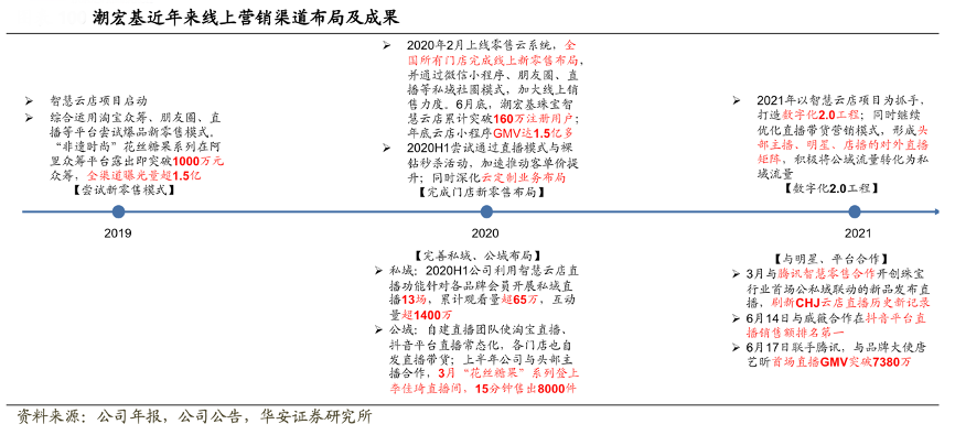 經典案例:根據(jù)公司年報、公司公告、華安證券研究所等綜合資訊表明,自2019年智慧云店項目啟動,潮宏基數(shù)字化轉型不斷加速且效果顯著。2020年其全國所有門店完成線上新零售布局,同時公司公域、私域兩手抓,自建直播團隊,開展品牌會員私域直播。2021年其加速全渠道用戶生態(tài)系統(tǒng)建設,打造數(shù)字化 2.0 工程,通過大數(shù)據(jù)挖掘及探索,形成用戶資產的數(shù)字化及標簽化管理,持續(xù)深化全天候全域的新零售商業(yè)模式。