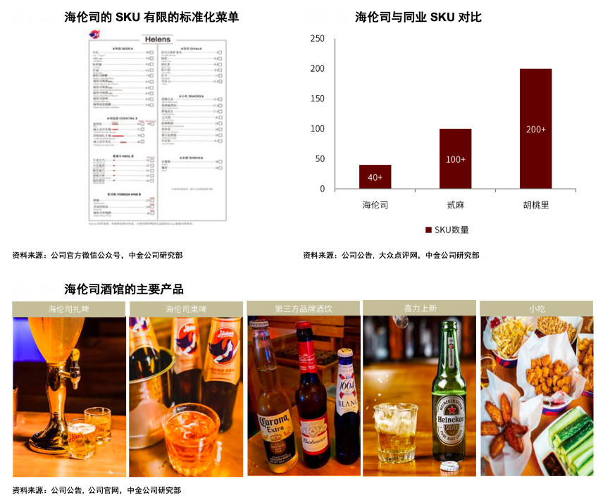 經典案例:根據公司官方微信公眾號、公司公告、公司官網、大眾點評網、中金公司研究部等綜合資訊表明,海倫司公司優化菜單,將 SKU 限制在大約 41 種,包括 24 種酒精飲品、8 種小吃、6 種軟飲料、以及 3 種其他產品(作為對比,貳麻酒館有 100 多個 SKU,胡桃里音樂酒館有 200 多個 SKU)。其在中國區域內的海倫司小酒館提供統一的產品組合。同時,所有啤酒產品都是產成品,小吃一般為訂制產品并易于加工。優化且統一的產品組合簡化了采購、物流、食物處理的全流程,且提高了存貨周轉率。