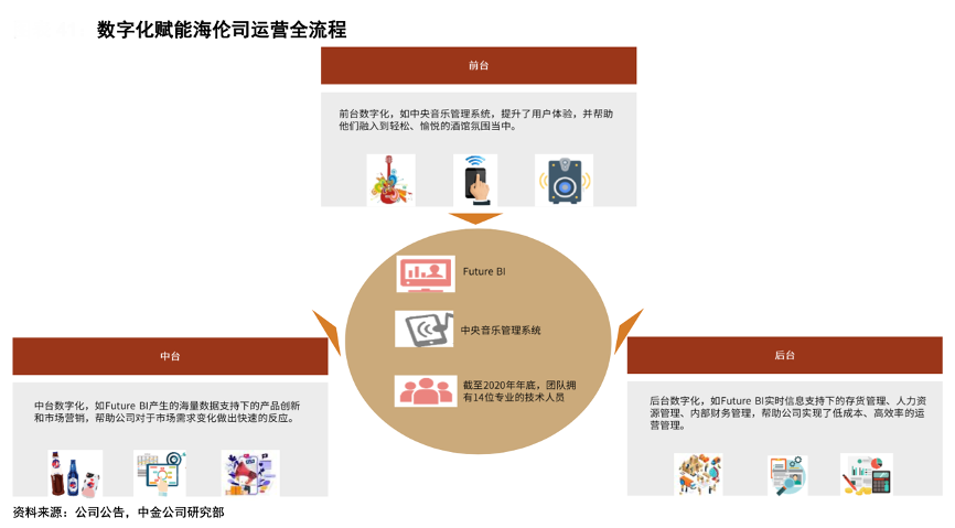 經典案例:根據公司公告、中金公司研究部等綜合資訊表明,數字化賦能海倫司運營全流程,海倫司利用自主研發的商業智能管理系統(Future BI) 中的海量數據(例如銷售量和存貨水平),來緊密跟蹤市場趨勢,幫助其做出各種方面的經營決策。