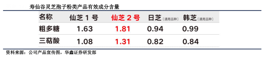 經(jīng)典案例:根據(jù)公司產(chǎn)品宣傳圖、華鑫證券研究部等綜合資訊表明,壽仙谷公司從1993 年開(kāi)始開(kāi)展靈芝優(yōu)良新品種的選育工作。經(jīng)過(guò)多年的實(shí)驗(yàn)研究,自主選育出的“仙芝 1 號(hào)”和“仙芝 2 號(hào)”具有抗逆性強(qiáng)、高產(chǎn)和高活性等特點(diǎn),且優(yōu)良特性能夠穩(wěn)定遺傳。其中“仙芝 1 號(hào)”源 于野生種質(zhì),經(jīng)過(guò)誘變選育而成;“仙芝 2 號(hào)”則是在“仙芝 1 號(hào)”基礎(chǔ)上通過(guò)航天 誘變而成。其已為自有靈芝品種建立特定的 DNA 分子圖譜,實(shí)現(xiàn)對(duì)品種的保護(hù)。