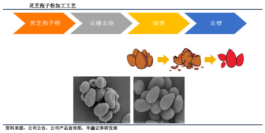 經(jīng)典案例:根據(jù)公司公告、公司產(chǎn)品宣傳圖、華鑫證券研究部等綜合資訊表明,壽仙谷公司開(kāi)發(fā)了靈芝孢子粉系列產(chǎn)品。其中,中藥飲片——壽仙 谷靈芝孢子粉(破壁)是“仙芝 1 號(hào)”經(jīng)過(guò)破壁技術(shù)加工后得到的產(chǎn)品;保健品—— 壽仙谷破壁靈芝孢子粉/顆粒是“仙芝 2 號(hào)”經(jīng)過(guò)去壁技術(shù)加工后得到的產(chǎn)品。另外還有靈芝孢子片劑和芝孢子油軟膠囊等多種劑型產(chǎn)品。